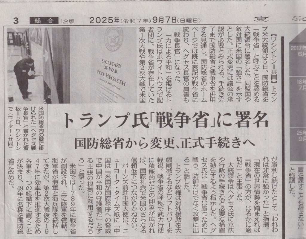 国防総省はトランプの命令で戦争省と名前を戻したと。