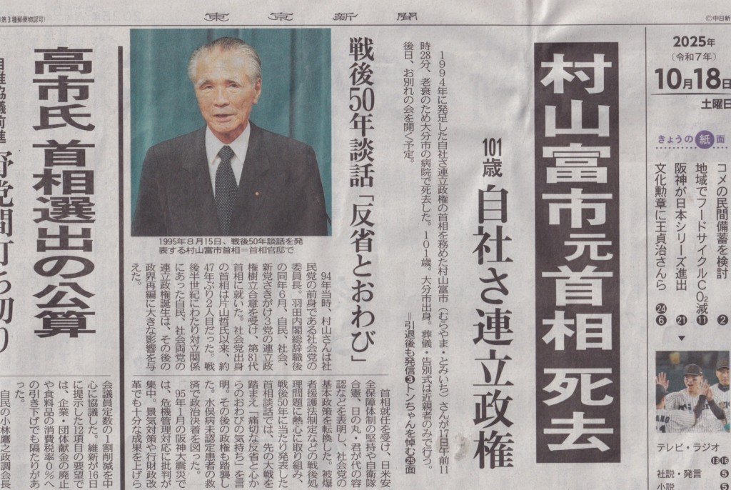 1994年に発足した自社さ連立政権の首相を務めた村山富市さんが101歳で亡くなりました。