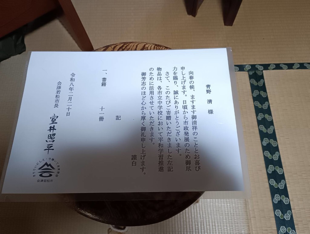 今日、会津若松市長さんにお会いして、市内の中学校に花岡しげる著「14歳から 考える恒久平和の つくり方」11冊と市長さんにも1冊、寄贈して きました。